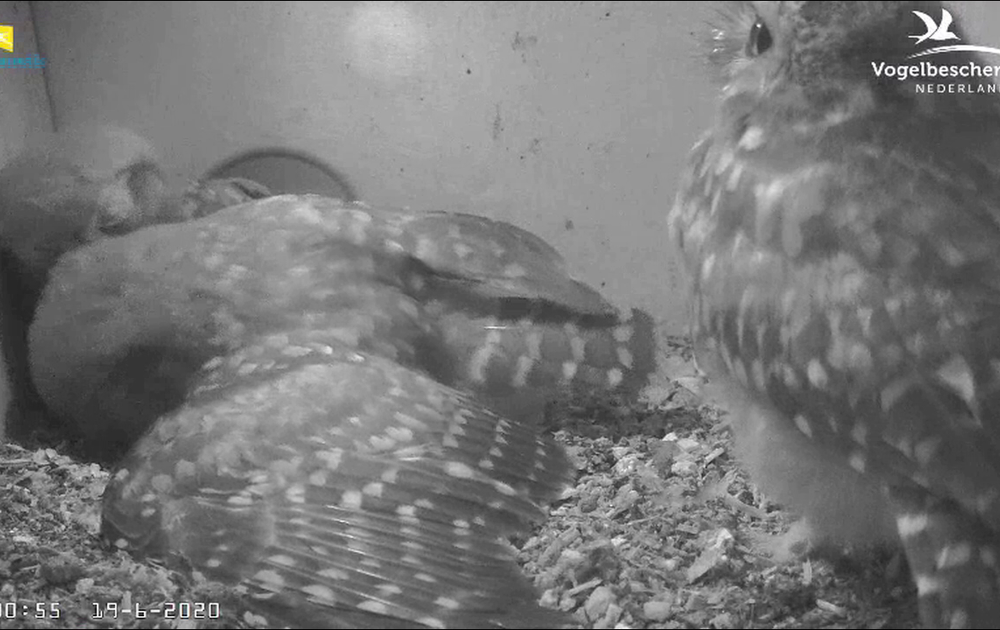 Overdag zouden jonge steenuilen moeten rusten, dat doen ze op hun manier.