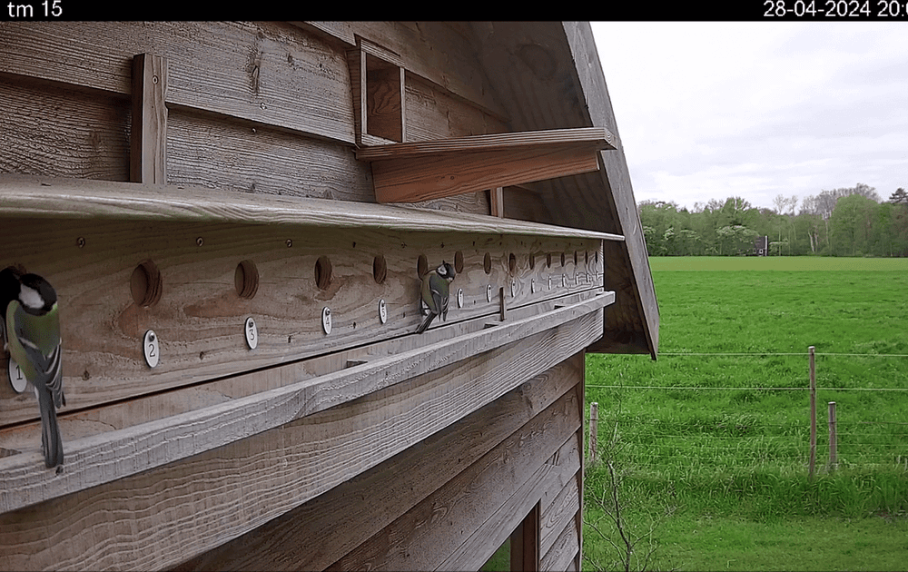 Dankzij Claus de tuineigenaar een grappig filmpje over de moeilijkheden van het koolmezenleven in een mussenflat. Het vrouwtje was bezig met nestmateriaal stoppen in alle nestkasten en zelfs na het dichtmaken van alle ingangen behalve nr. 1 was het voor haar even wennen. Het mannetje had minder problemen met het onthouden van de juiste ingang en wees het vrouwtje de weg.