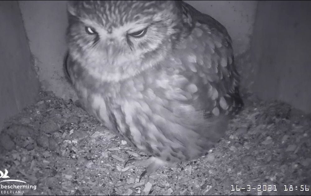 Man steenuil was de hele middag niet in beeld. Vrouw was de hele middag in de kast. Zij roept als de avond gaat vallen. En krijgt antwoord.