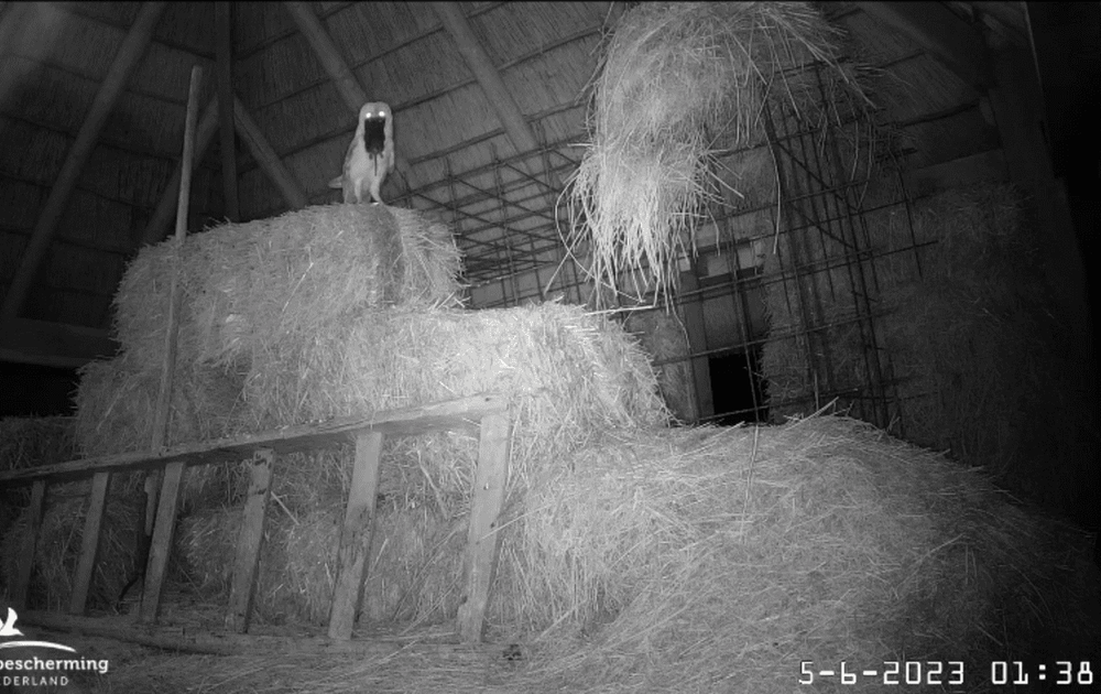 V komt met een Woelrat op de hooibalen en begint deze op te eten.