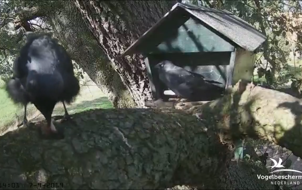 Een kauw legt een brokje eten (stukje peer?) neer in de holte in de tak van de perenboom. Is dit wel veilig?