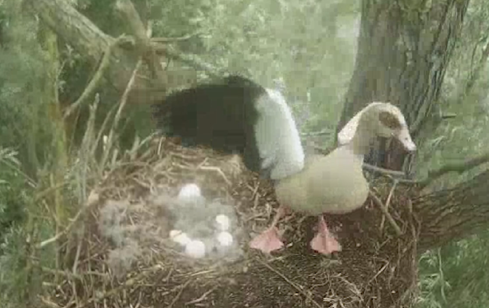 Vrouw nijlgans heeft al een tijd geen last gehad van andere storende nijlganzen. Echter betekent dit niet dat het broeden nu heel rustig gaat. Een roepende koekoek in je boom, harde wind waardoor je niet goed het nest op kan komen en iets anders waar de nijlgans erg van schrikt.