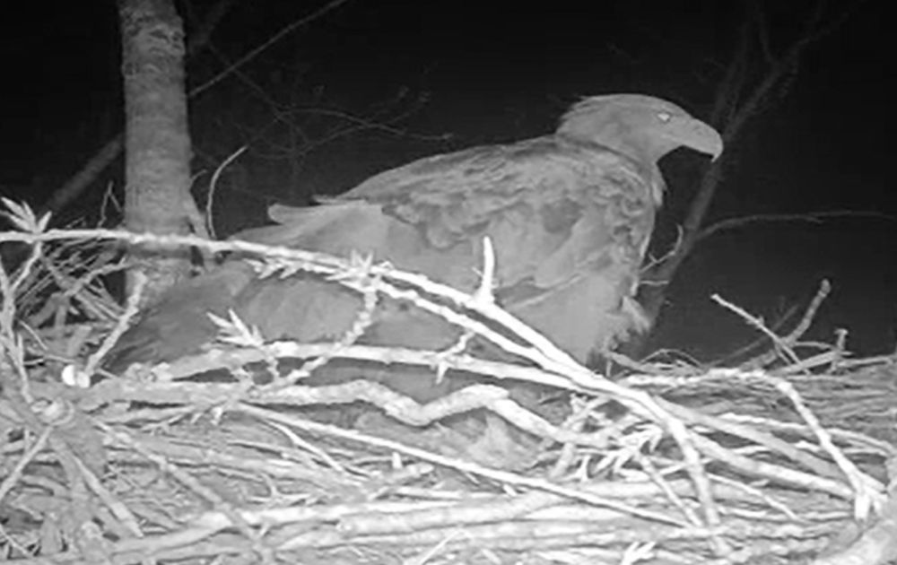 Man en vrouw zeearend wisselen het broeden regelmatig af. Rond het nest is het niet altijd even rustig. Verschillende vogelsoorten verstoren de boel soms.