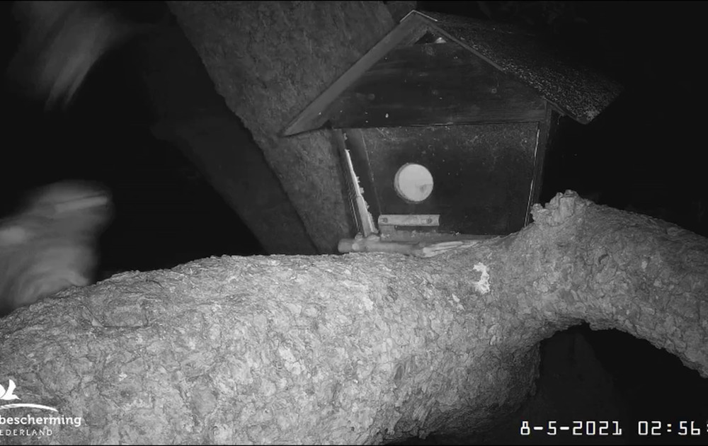 Man met regenworm komt uit de nestkast, beiden schrikken van elkaar en vrouw benadert daarna de nestkast zeer voorzichtig.