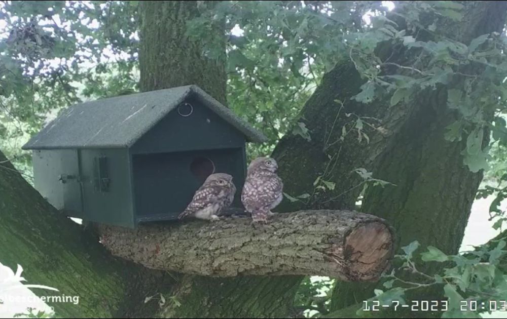 Twee jonge steenuilen in de nestkast en twee voor de nestkast. Voor het eerst sinds 24 juni (18 dagen geleden) zijn de vier jonge, uitgevlogen steenuilen tegelijk in beeld.
