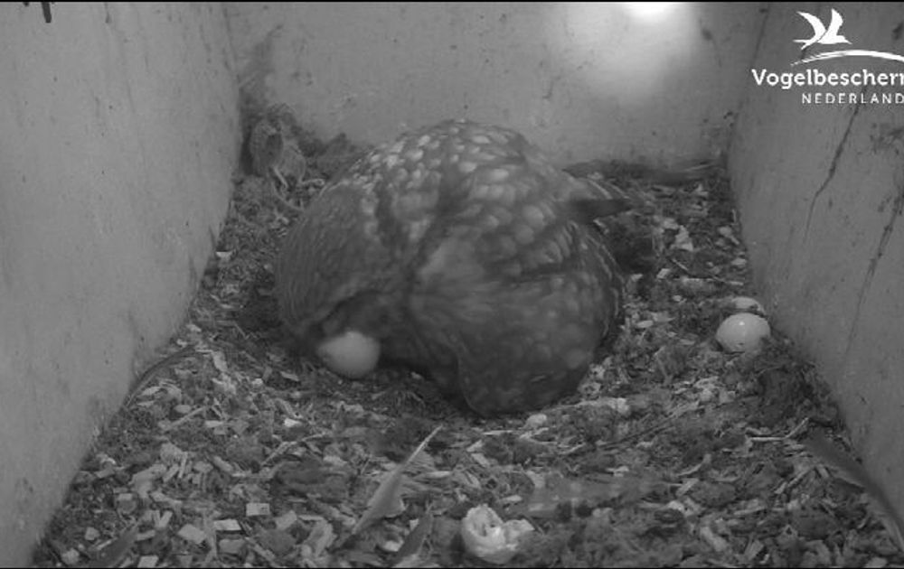 17 mei, kwart over acht in de ochtend. Vrouw steenuil pakt een stuk eischaal onder zich vandaan. Is het nieuw of oud? In ieder geval eet ze een grote eischaal om iets over negen. Daar is dan kuiken nummer vier. 20 minuten later komt vader met een muis. Op dat moment laat moeder hun vier prachtige kuikens zien....... Locatie Winterswijk.