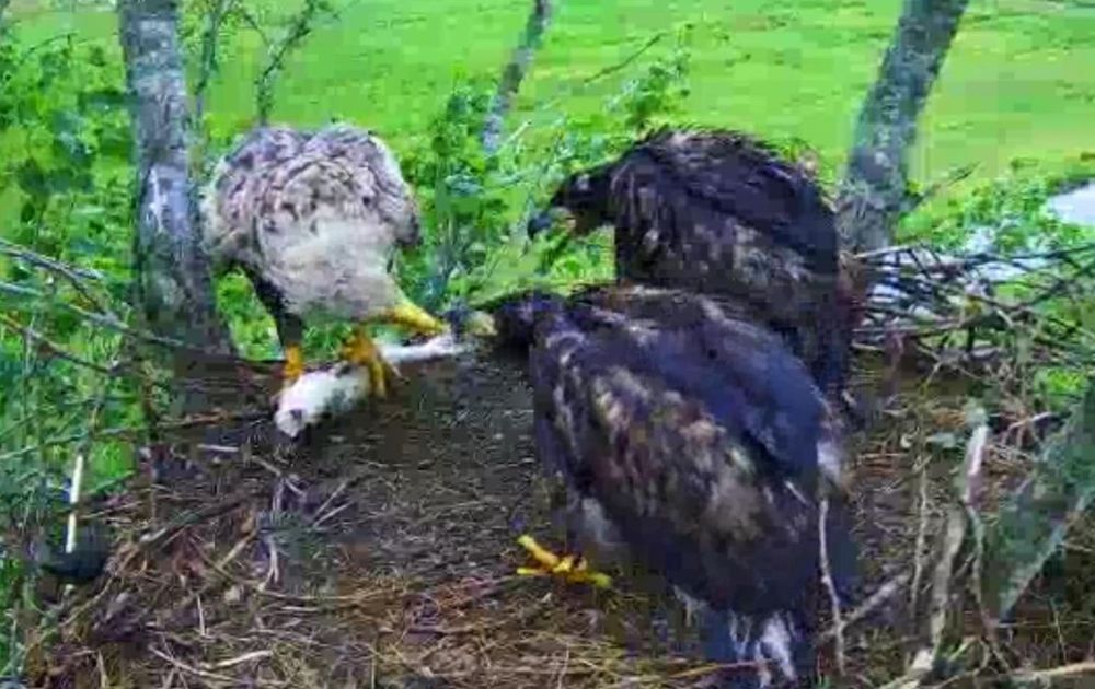 Ondanks dat de omgeving stikt van de eetbare watervogels, kiezen deze arenden toch ook graag voor een vis.