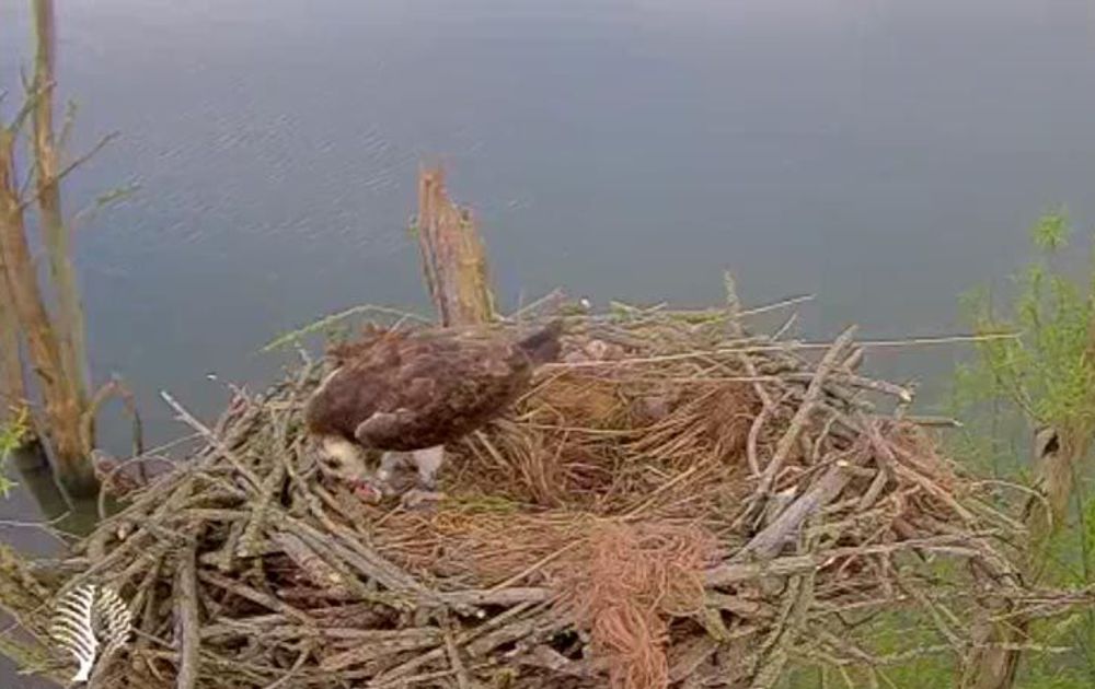 We zien het M niet vaak doen. Een vis eten op het nest. Vorige week zagen we het ook al even, maar vanmorgen nam hij wel uitgreid tijd voor het ontbijt.