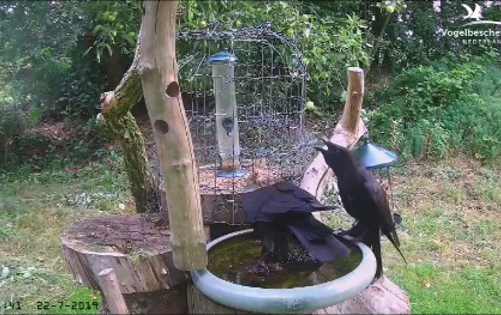 Het lijkt alsof de zwarte kraai staat te drinken, maar eigenlijk staat ie, van de voertafel gevallen, eten uit het water te vissen. En konijntje vindt een lekkere stukje appel, wat helemaal opgepeuzeld wordt