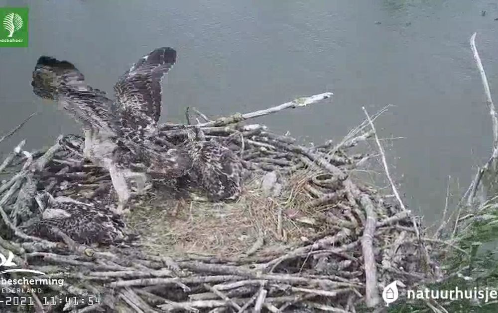 De kuikens zijn al echte pubers. En net als andere pubers zijn sommige lichaamsdelen nog niet in verhouding. Maar wordt er wel al druk mee geoefend.