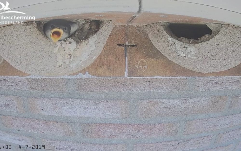 Het kuiken begint steeds meer te lijken op vader en moeder. Het kopje gaat steeds verder naar buiten en de kom wordt toch echt bijna te klein voor de vliegoefeningen...
