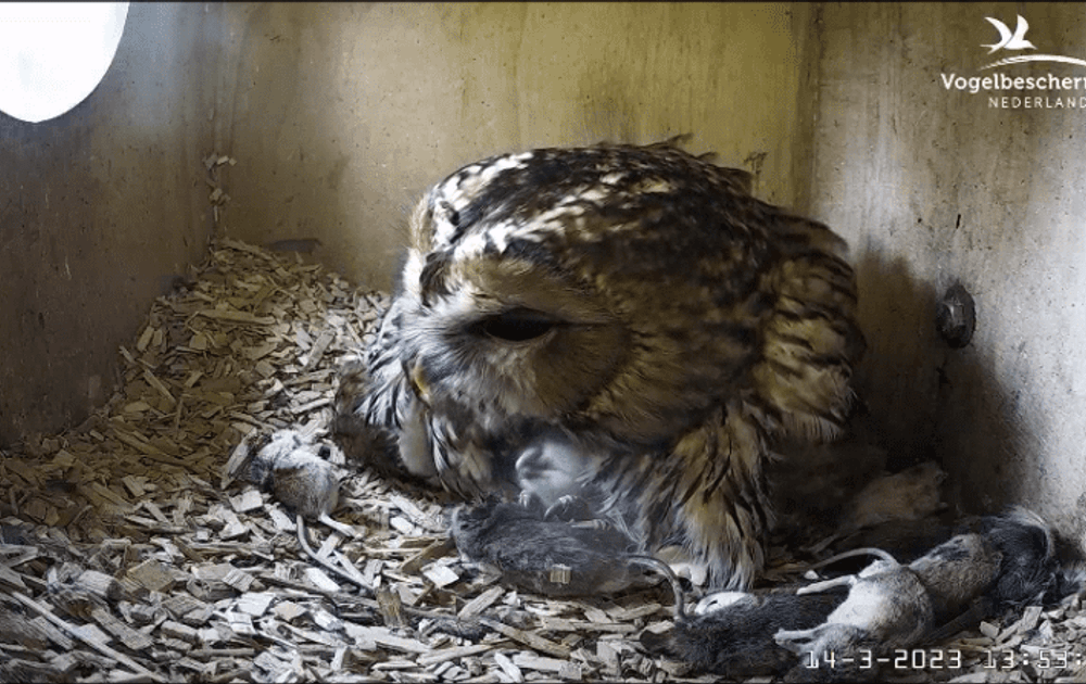 Vrouw bosuil zit vaak met de kop richting camera en besluit dan ook wel eens om het kuiken te voederen. Voor velen een 'smeltmoment'