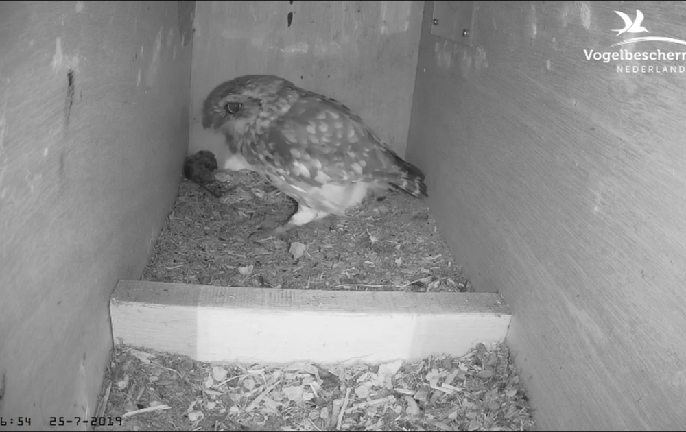 Man steenuil legt een ware muis in de nestkast, kauwtjes slepen de muis naar buiten en eten de muis op. Vrouw steenuil komt later de muis tevergeefs zoeken.