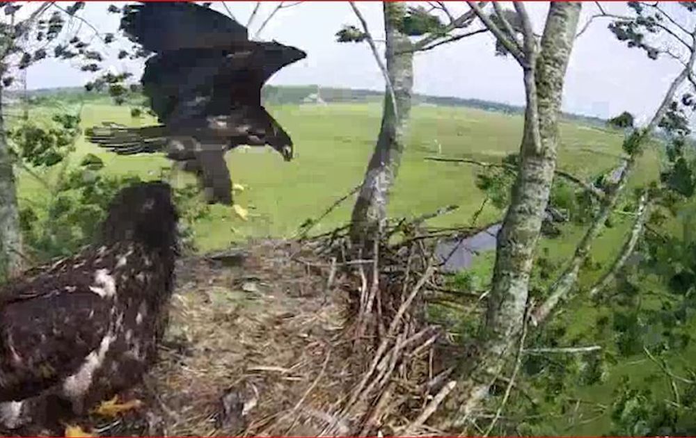De jonge zeearenden worden snel sterker. Hun vleugelslagen lijken per dag krachtiger te worden. Geen wonder want de ouders blijven maar prooien aanvoeren.