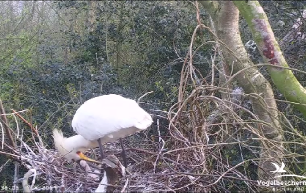 Om 7:37 een mooie voedering. Later in de ochtend lijkt er een lepelaar te dicht in de buurt te komen vlak voordat man op het nest komt. Zo te zien kijkt vrouw eerst naar beneden, terwijl man van boven komt