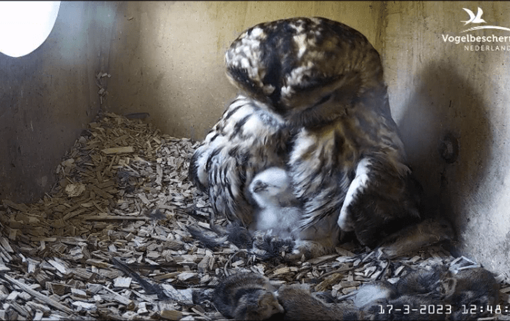 Samen met vrouw bosuil eet het kuiken van een vogel die man bosuil de avond te voren heeft gebracht. Grote stukken al.