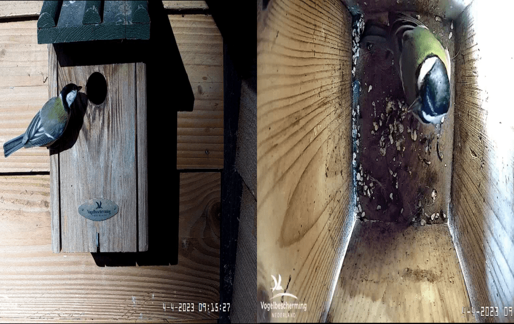 De nestkast kreeg bezoek van twee koolmezen. Het mannetje gaf een rondleiding van binnen en het vrouwtje keek grondig rond van buiten. Voldoet het huisje aan hun eisen?