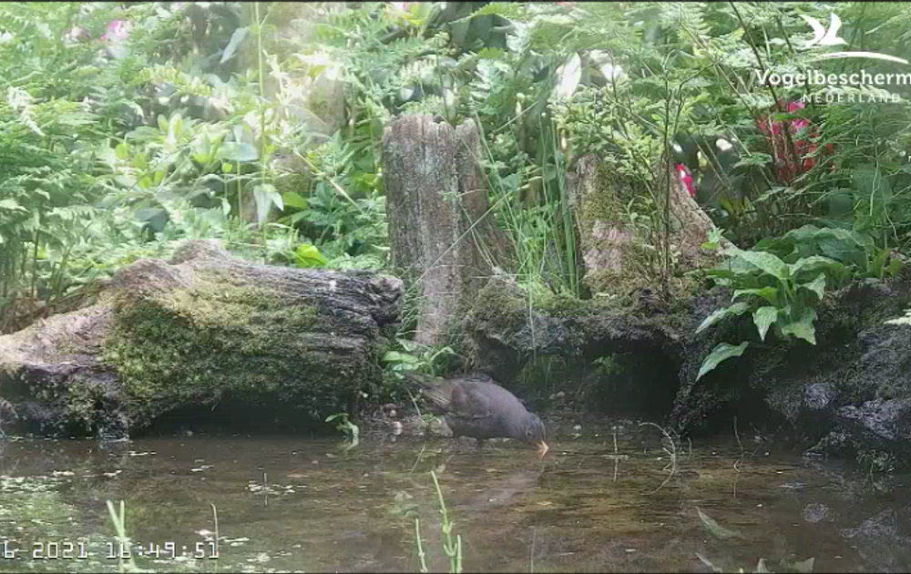 Eén kanttekening bij deze clip: 100% zeker dat dit 'onze' vrouw merel is, kan niet worden gegeven. Rugnummers ontbreken helaas. Maar de tijden kloppen wel dat ze weg is van het nest en bij het water is.