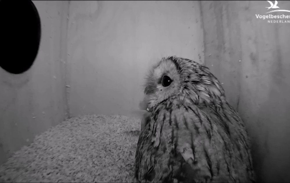 Een nieuwe fase in het spel richting eileg! Man bosuil kondigt zich heel in de verte aan met een prooi en als reactie vliegt vrouw bosuil de kast in. Daar bedelt ze verder om de hap. Man bosuil heeft waarschijnlijk nog niet door dat hij de prooi moet overdragen door het vlieggat (een broedende vrouw moet zó worden gevoed). Dan maar naar buiten om daar de prooi te krijgen.