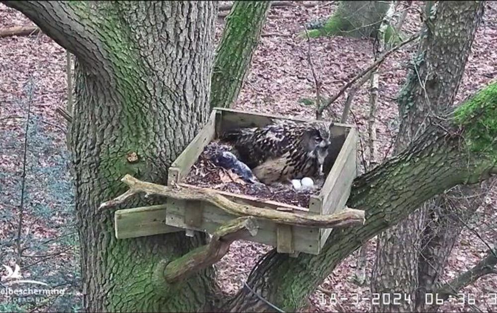 “Hoe eet een oehoe? We zien V muisjes in 1x doorslikken, maar met grotere prooien vliegt ze weg. Scheurt ze die op een andere plek in stukken om ze dan door te slikken, of passen ook grotere prooien in 1x door de snavel en keel?”