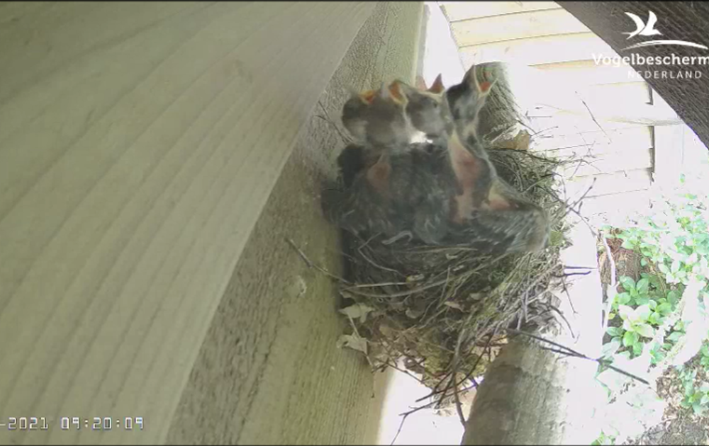De jonge merels worden steeds groter en de ruimte waarin ze verkeren groeit niet mee. Dus de 'bak' wordt steeds voller.