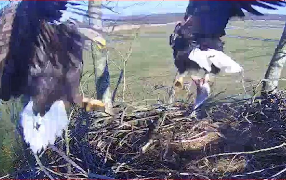 Er landt een Zeearend op het nest. Voor je kunt bedenken welke van het paar het is duikt V er van buiten beeld bovenop en jaagt hem schreeuwend weg. Òf… niet?