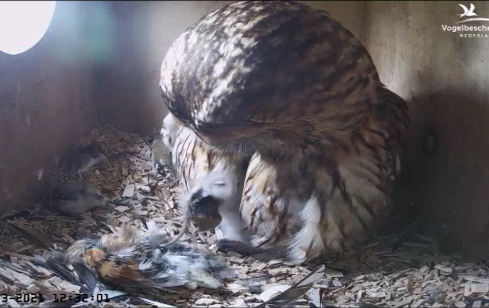Ondanks de aanmoedigingen van van vrouw bosuil lukt het het jongste kuiken niet om ruim een halve muis naar binnen te werken. Dan is het de beurt aan het oudste kuiken. Dat lukt wel. Een voorgekauwde muis dus.