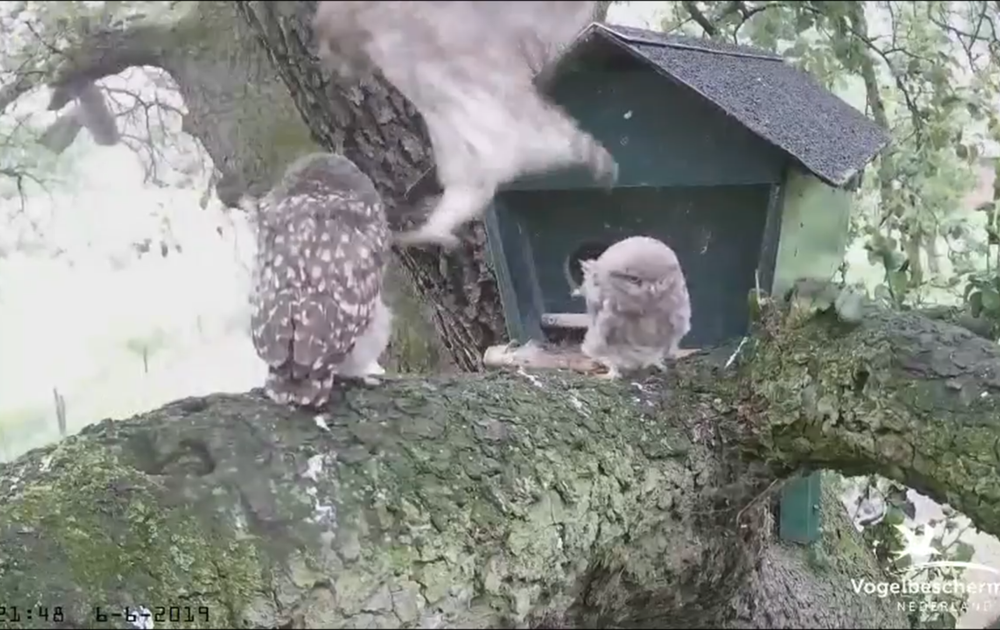 vrouw steenuil vertoont vreemd gedrag tot 2x toe. Het kuiken met de ring links lijkt niet onder de indruk