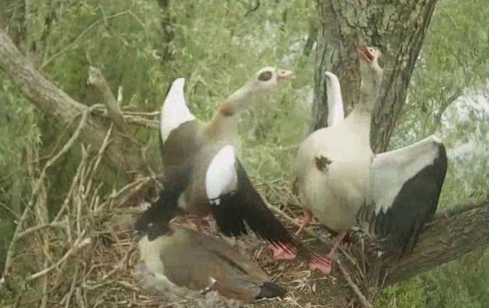Het lijkt erop dat het broeden nu toch echt begonnen is. Maar het broedende nijlgans vrouwtje wordt nog steeds lastig gevallen door andere nijlganzen. Voor hen is zij de vreemde eend in de bijt.