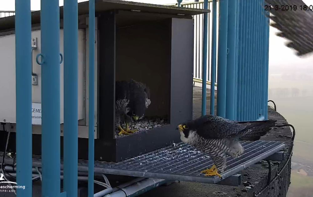 Met man komt een vreemde valk mee.Waarschijnlijk een vrouwtje, want ons vrouwtje doet haar uitgeleide