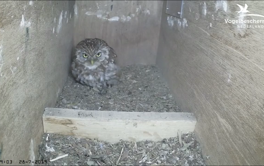 Vrouw steenuil slaat een muis op in de nestkast van de buurkauwen. Ze komt even later terug (om op de muis te passen). Als het licht is komen de holenduiven en kauwen en vrouw steenuil gaat de kast in. Na 20 minuten is de kust veilig wn vliegt vrouw steenuil met de muis weg.