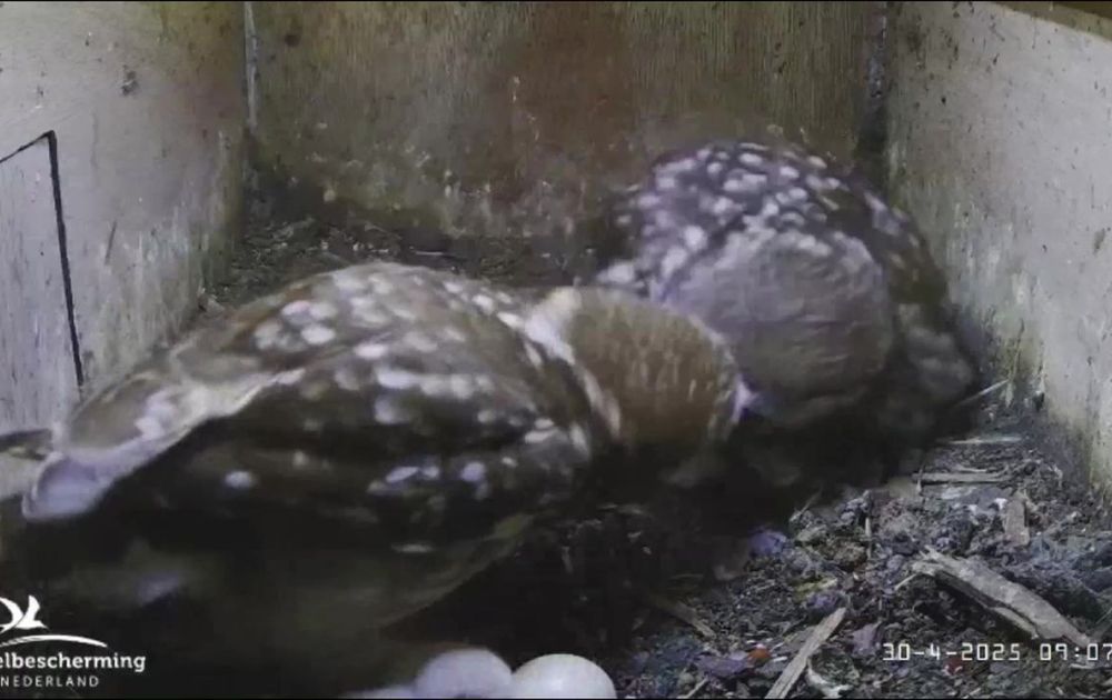 Vrouw steenuil versleept een voorraadmuis om het kuiken te gaan voeden, maar Man onderbreekt haar door een hapje te brengen.