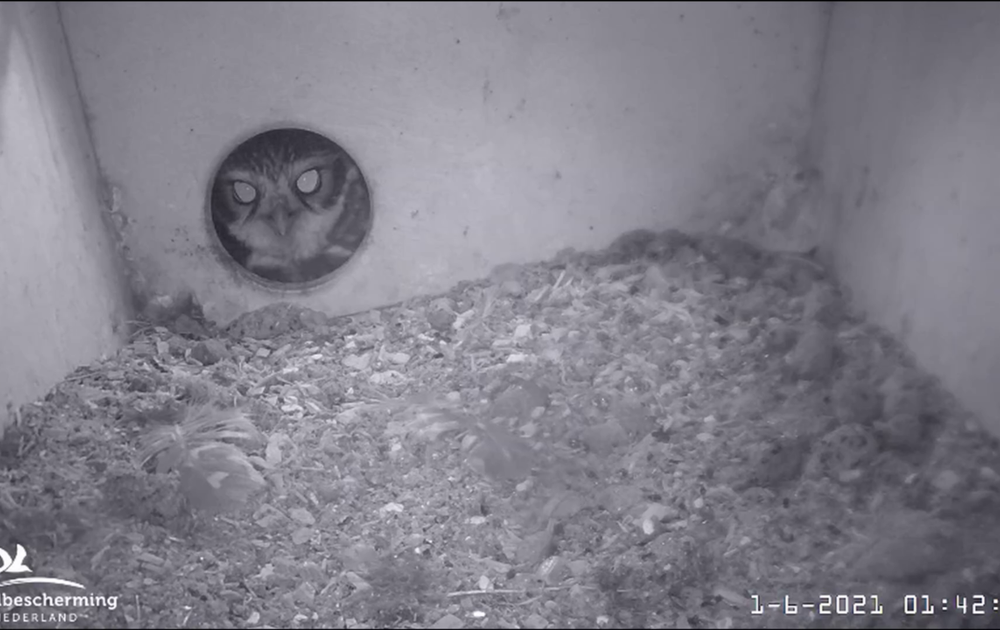 Vrouw steenuil verliet om 21:20 op 31 mei de nestkast met de eitjes.