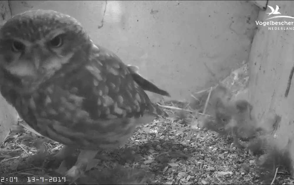 Vrouw steenuil was op 13 september ruim 7 uur in de nestkast: van 7:30 tot 14 uur en van 18:45 tot 19:45 uur.