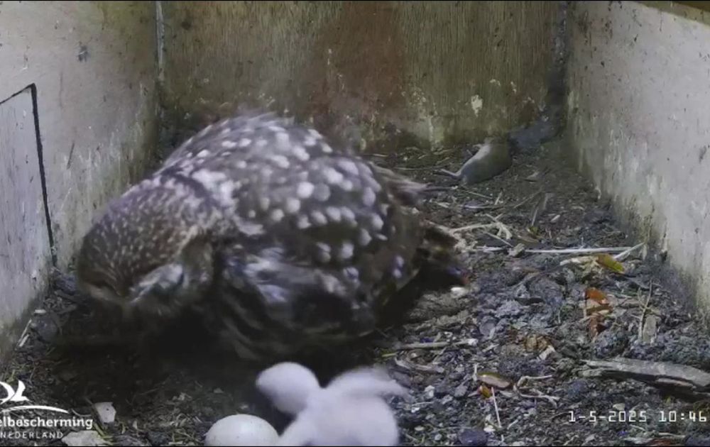 Op 1 mei is het warm. Vrouw steenuil doet haar plicht in de nestkast en het kuiken eet er goed van.