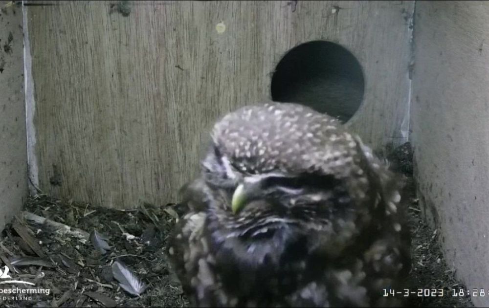 Overdag rusten de steenuilen in de nestkast. Vrouw steenuil geeft het startsein voor de vertrekprodecure. Een fazant laat ze nog even schrikken, voordat het hoogtepunt van het vertrekritueel komt.