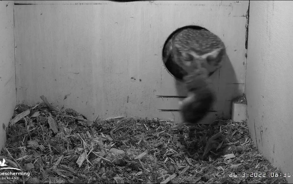Nadat vrouw de kast uit is gegaan, gaat het net zoals met de “verhuis-muis” van twee dagen geleden. Man steenuil komt de rest van de muis halen en vliegt er mee weg.