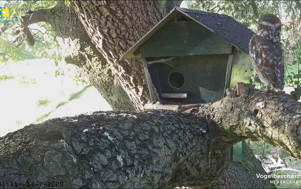 Vrouw steenuil bewaakte de nestkast lang op deze zonnige avond: geen bedelende jongen gewenst.
