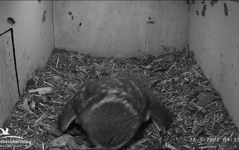En op 28 mei overdag verblijft vrouw steenuil ongeveer 6 uur in de nestkast