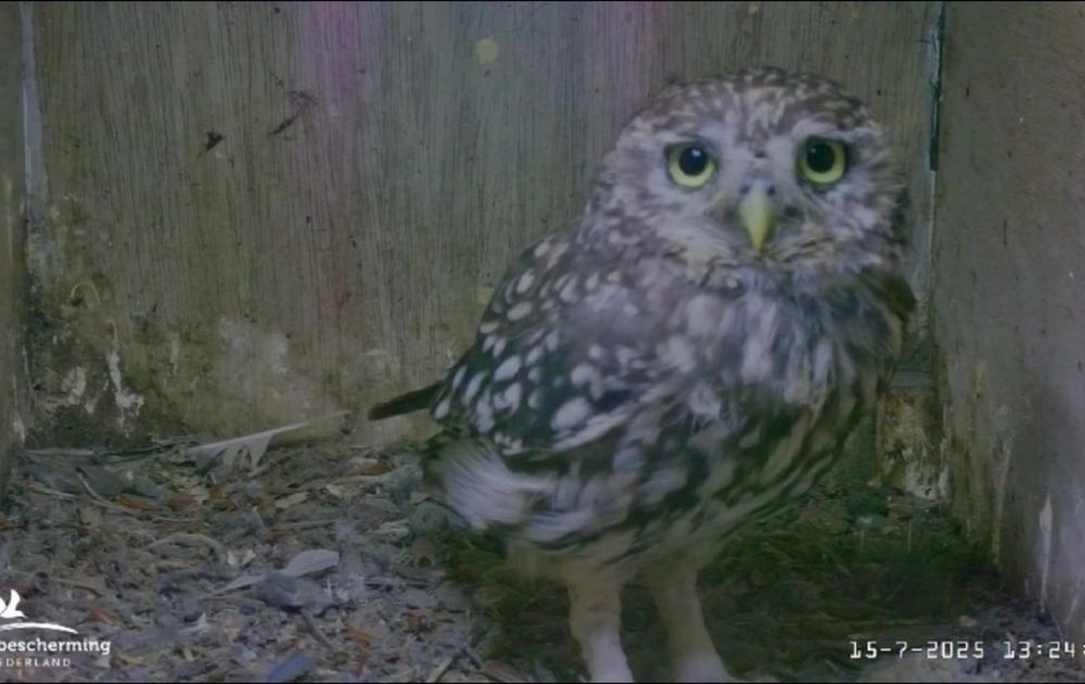 Nadat gisteren Man en kuiken weer in beeld kwamen, komt nu ook Vrouw steenuil even in beeld om de nestkast te inspecteren.