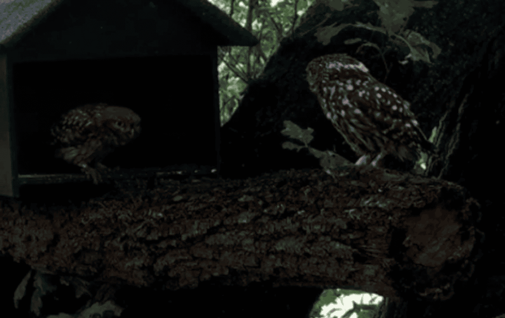 Kuiken Rechtspoot zit te bedelen voor de nestkast. Vrouw steenuil daalt neer en start direct met het aanvallen van Rechtspoot.