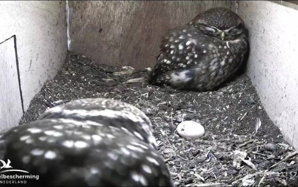 Op één ei gaat vrouw steenuil nog niet broeden. Man zorgt ervoor dat vrouw eet, er zijn meer eieren in de maak.