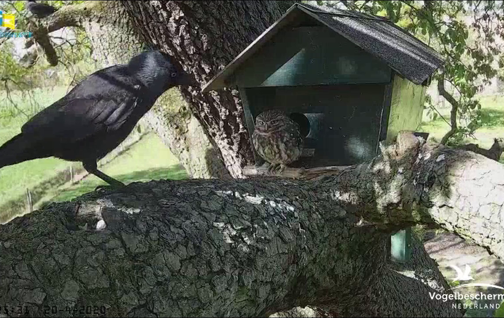 Het kauwtje neemt het niet zo serieus, man steenuil slaat toe als hij de kans krijgt.