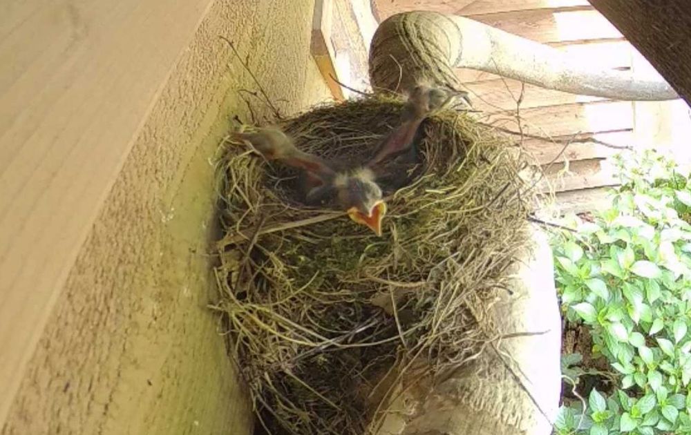 Hoewel de jonge merels goed beschut zijn tegen de directe zon, is het natuurlijk zo onder het dak ook erg warm!