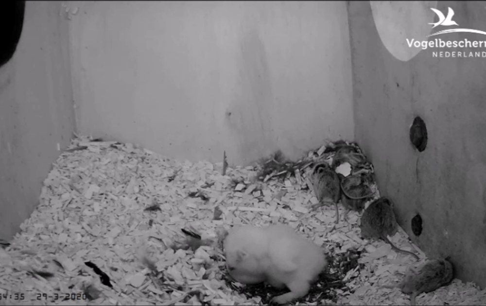 Kort daarna komt vrouw bosuil binnen met een vogel; een zanglijster? Zelf gevangen?