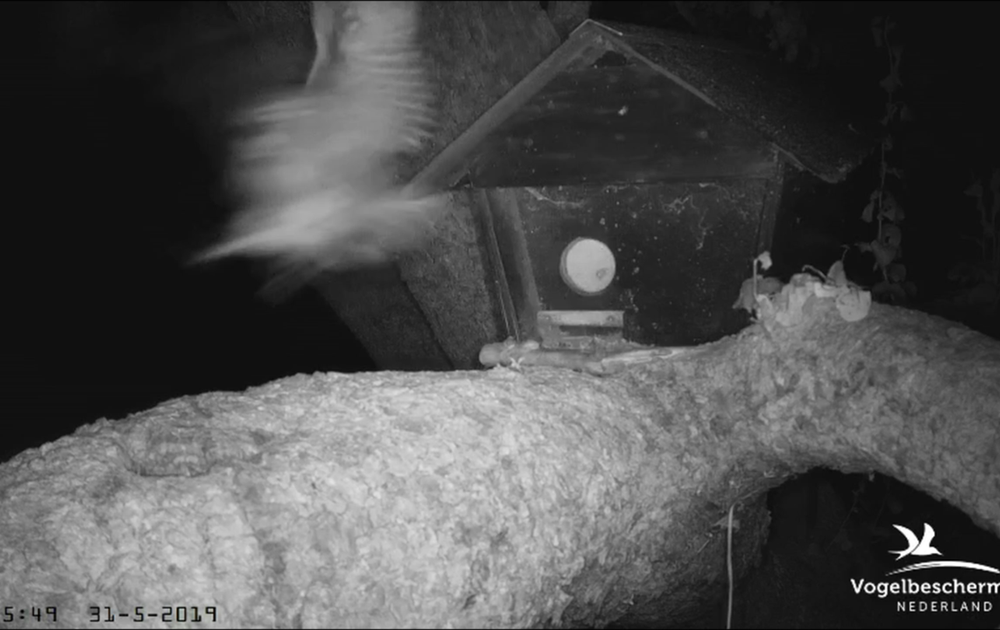 Vrouw steenuil ziet kennelijk een gevaar. Ze dreigt, slaat op de vlucht en komt terug. Dan klinkt ook een kerkuilgeluid.