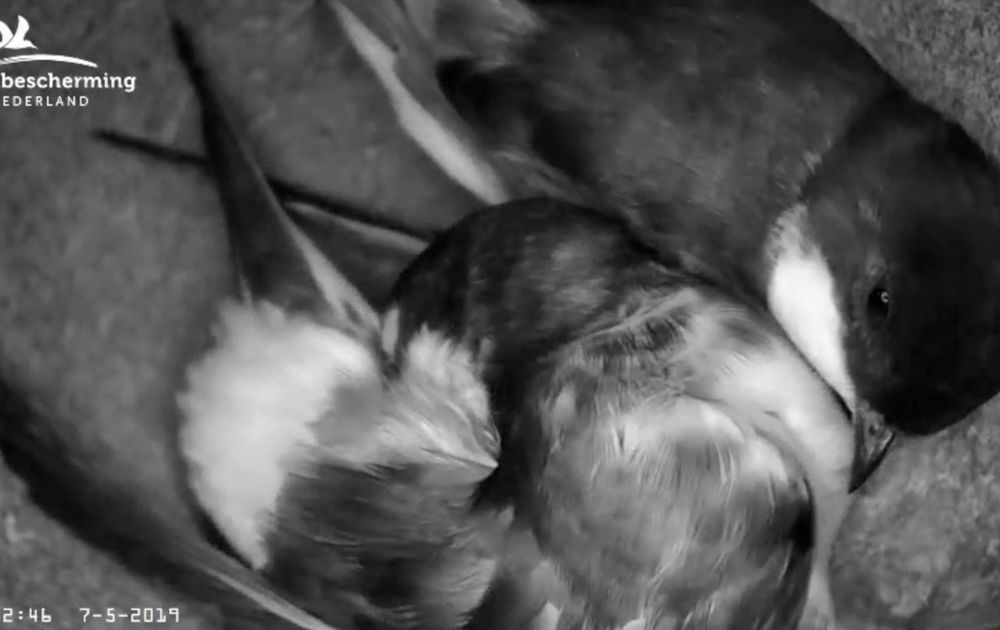 Het lijkt erop dat de linker kom geclaimed is door mooi paartje huiszwaluwen. De kraker mus kwam ook nog even buurten maar die werd snel de deur gewezen. Zoals je kunt zien moeten ze nog wel even wennen om zo bij elkaar op de lip te zitten. Een van de twee heeft de nacht doorgebracht in de kom.