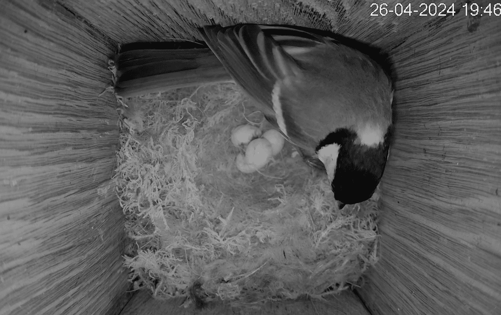 Ook voor de koolmees is het broedseizoen begonnen, het vrouwtje is inmiddels bezig met broeden in dit fraaie nest. Met vier eieren houden ze het behapbaar.