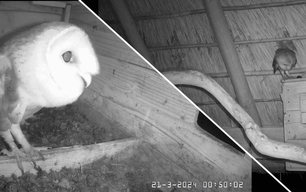 Wéér een vreemde uil in de hooiberg, alleen was de reactie van ons uilen paar opmerkelijk; in plaats van achter hem aan te gaan klonk er alleen een luid protest uit de kast.
