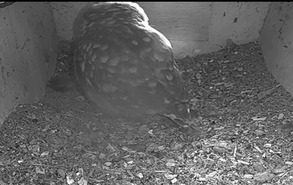 Vrouw steenuil gaat weer bedelsnurken en graven in de nestkast.